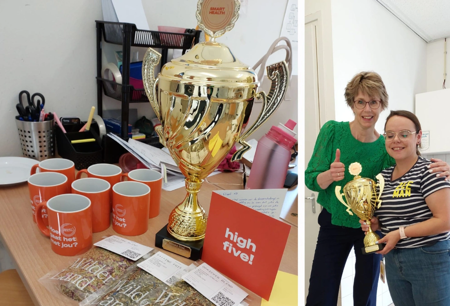 Romy Snijder, filiaalbeheerder Venlo: ‘Ons hele team deed mee aan de stappenchallenge, dat ging eigenlijk vanzelf. We zijn allemaal veel met gezondheid bezig, de meeste collega’s wandelen in hun vrije tijd en we hebben een aantal trappen in ons filiaal, dus we lopen veel op en neer. Na de eerste week zagen we dat we bovenaan stonden in onze regio; dat motiveerde om nog een paar stappen extra te zetten. En daar werden we voor beloond met een leuke prijs: een grote bokaal en theemokken met verse thee. Die worden dagelijks gebruikt. En de aandacht voor fitter worden, die blijft!’