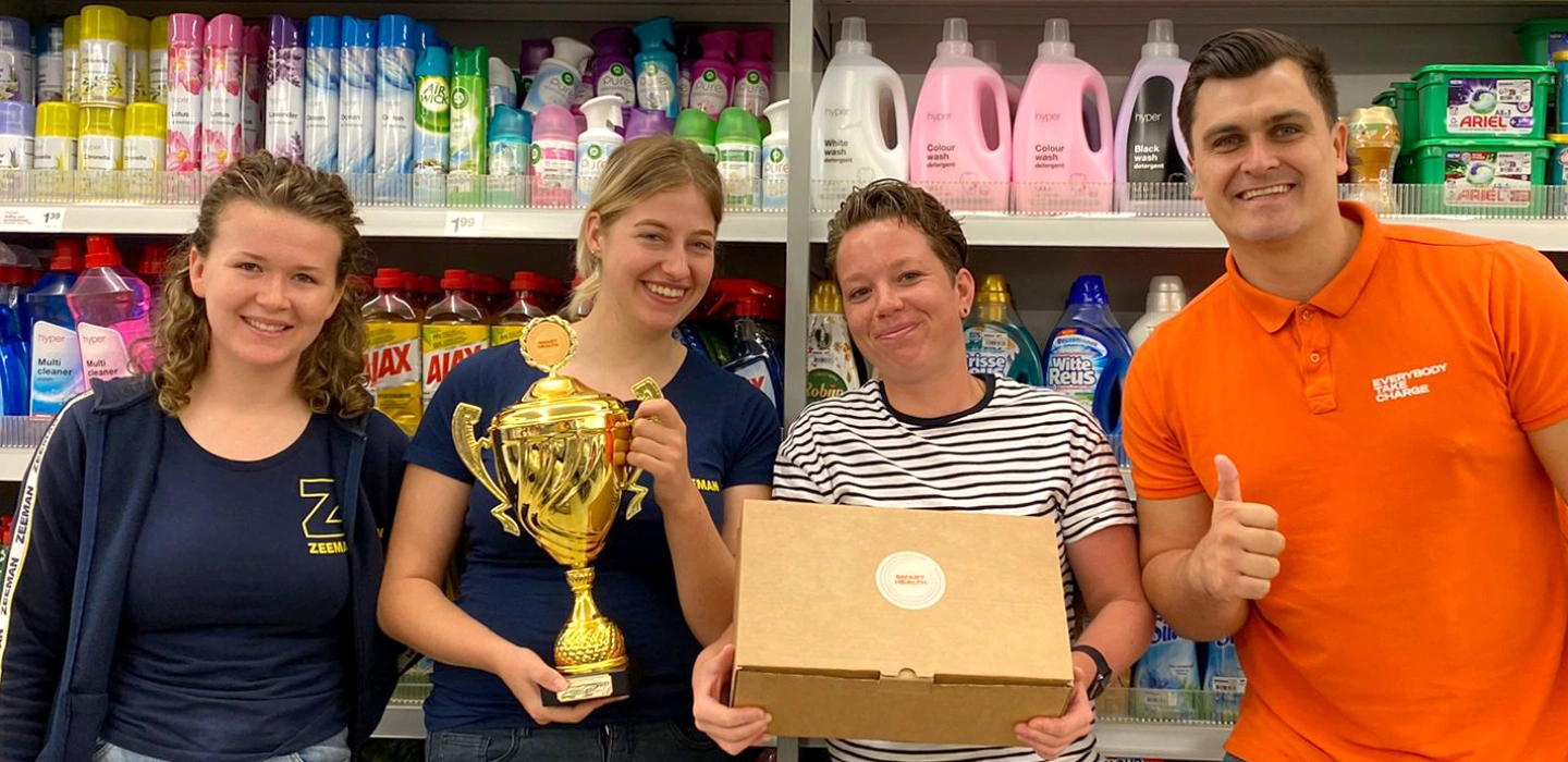Afgelopen zomer organiseerden we vanuit Smart Health een grootschalige stappenchallenge voor alle Zeemanwinkels van Nederland. Maar liefst 1.193 medewerkers van 455 filialen deden mee, onderverdeeld in 18 regio’s. Iedere deelnemende winkel kreeg persoonlijk bezoek van Smart Health en bij de regiowinnaars keerden we terug voor de prijsuitreiking. Dat leverde een enorme hoeveelheid stappen en veel enthousiaste medewerkers op.