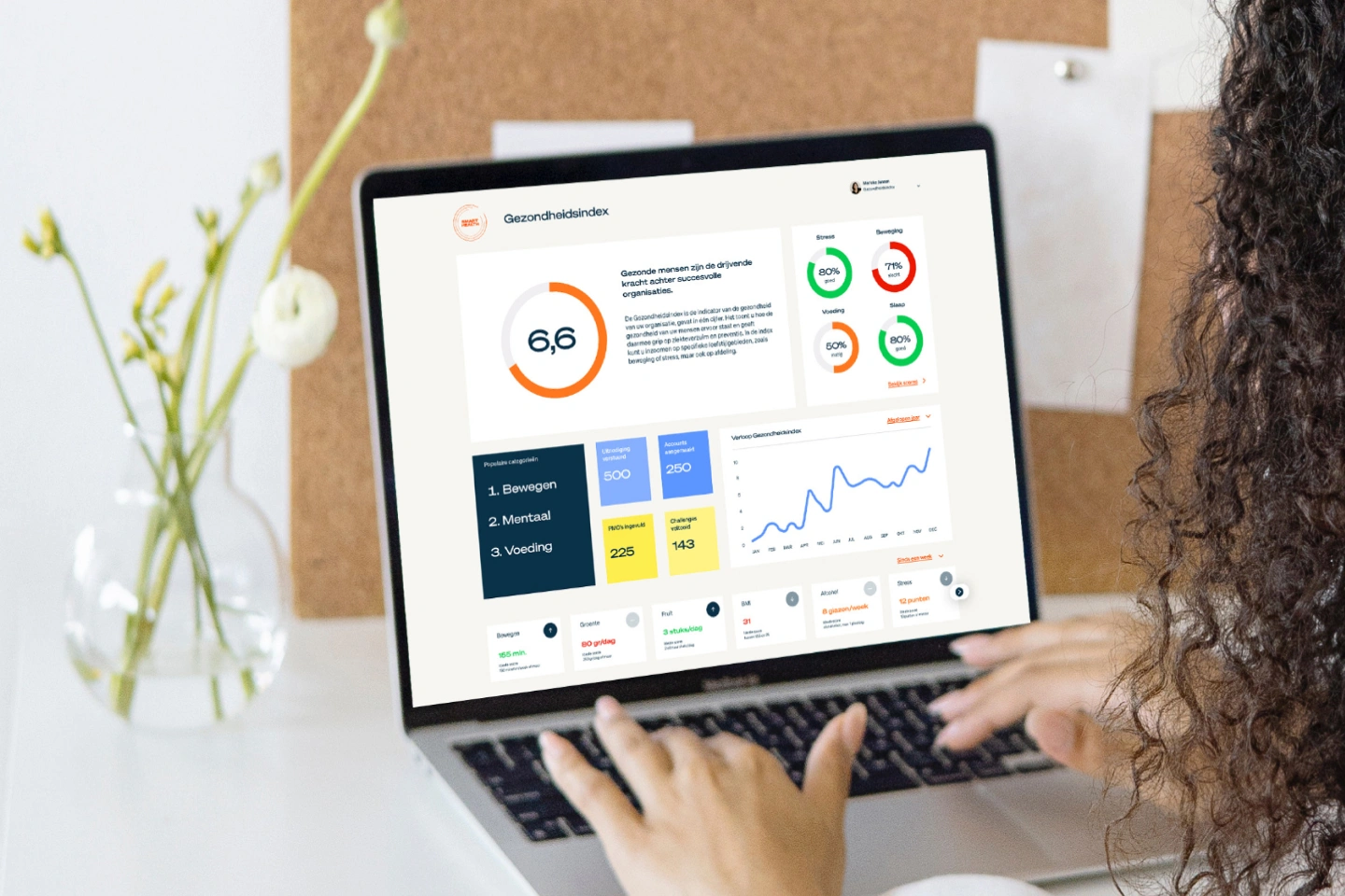 De gezondheidsindex maakt de gezondheid van uw organisatie in een oogopslag duidelijk: één overzichtelijk leefstijlcijfer op basis van de scores van twaalf verschillende leefstijlfactoren gemeten onder uw medewerkers. Voor meer inzicht zoomt u in per thema of per afdeling vanaf vijftig deelnemers. Dit geeft u grip op de inzetbaarheid en het werkgeluk van uw medewerkers. En daarmee op uw kosten.